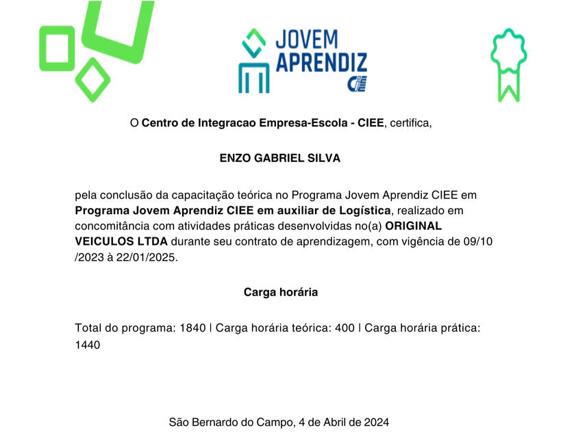 Me chamo Enzo Gabriel Silva, tenho 21 anos e nasci em Diadema, mas minha história foi escrita em São Bernardo do Campo, onde cresci e hoje moro no bairro Rudge Ramos. Venho de uma família unida, com um irmão, uma irmã e três sobrinhos incríveis. Atualmente, moro com minha mãe, que sempre foi meu maior alicerce.Sou uma pessoa criativa e curiosa, sempre buscando aprender coisas novas. Gosto de ouvir as pessoas, entender suas histórias e, sempre que possível, ajudar. Competitivo na medida certa, vejo desafios como oportunidades de crescimento. Acredito que a justiça e a correção devem guiar nossas atitudes, e não suporto injustiças ou o que está errado.Meu objetivo é simples, mas profundo: aprender ao máximo e ser feliz ao longo do caminho.